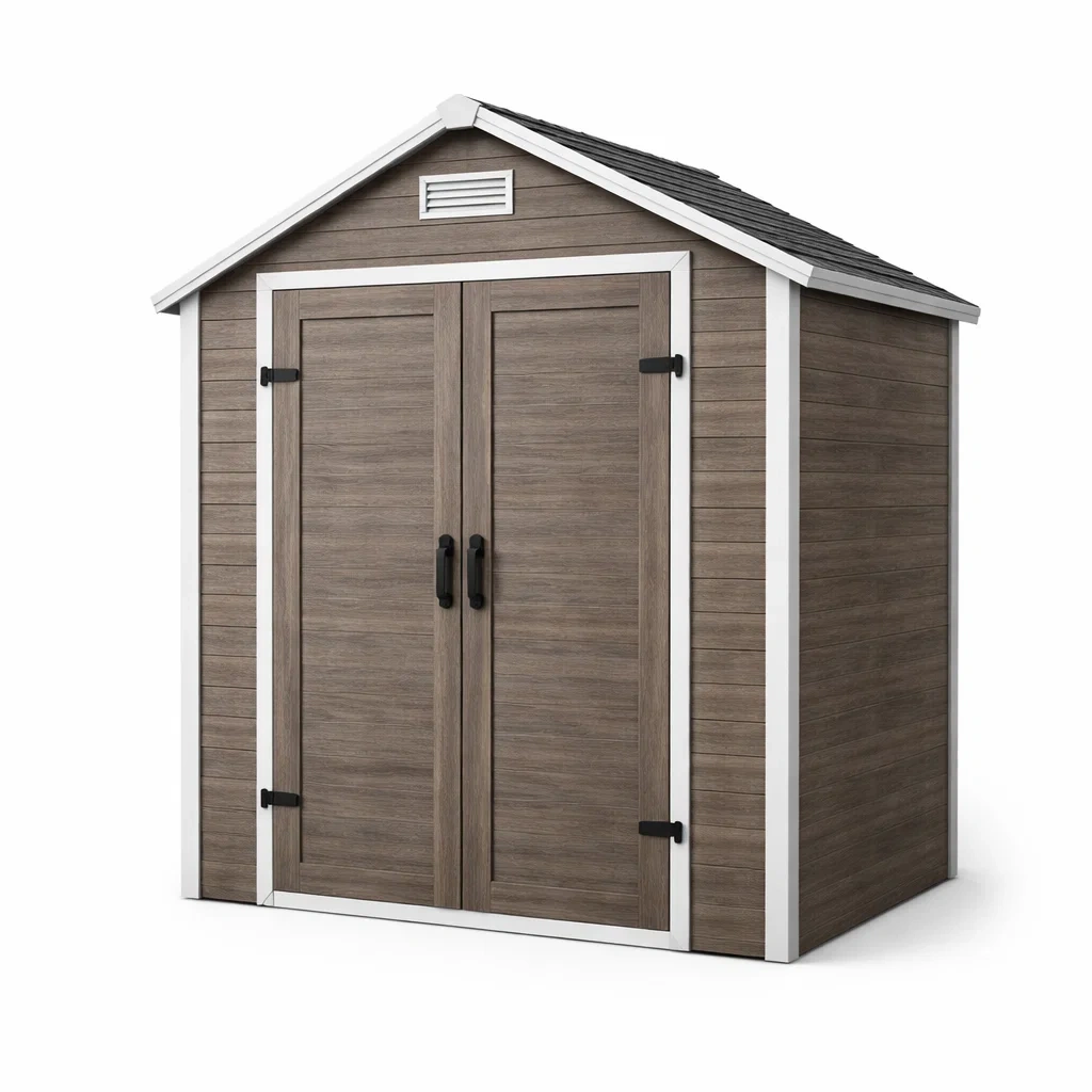 Il capanno da giardino è realizzato in resina resistente e acciaio rinforzato, con una finitura effetto legno. Le dimensioni sono 183 cm di lunghezza, 111 cm di larghezza e 243 cm di altezza. Adatto per lo stoccaggio di attrezzi da giardino.