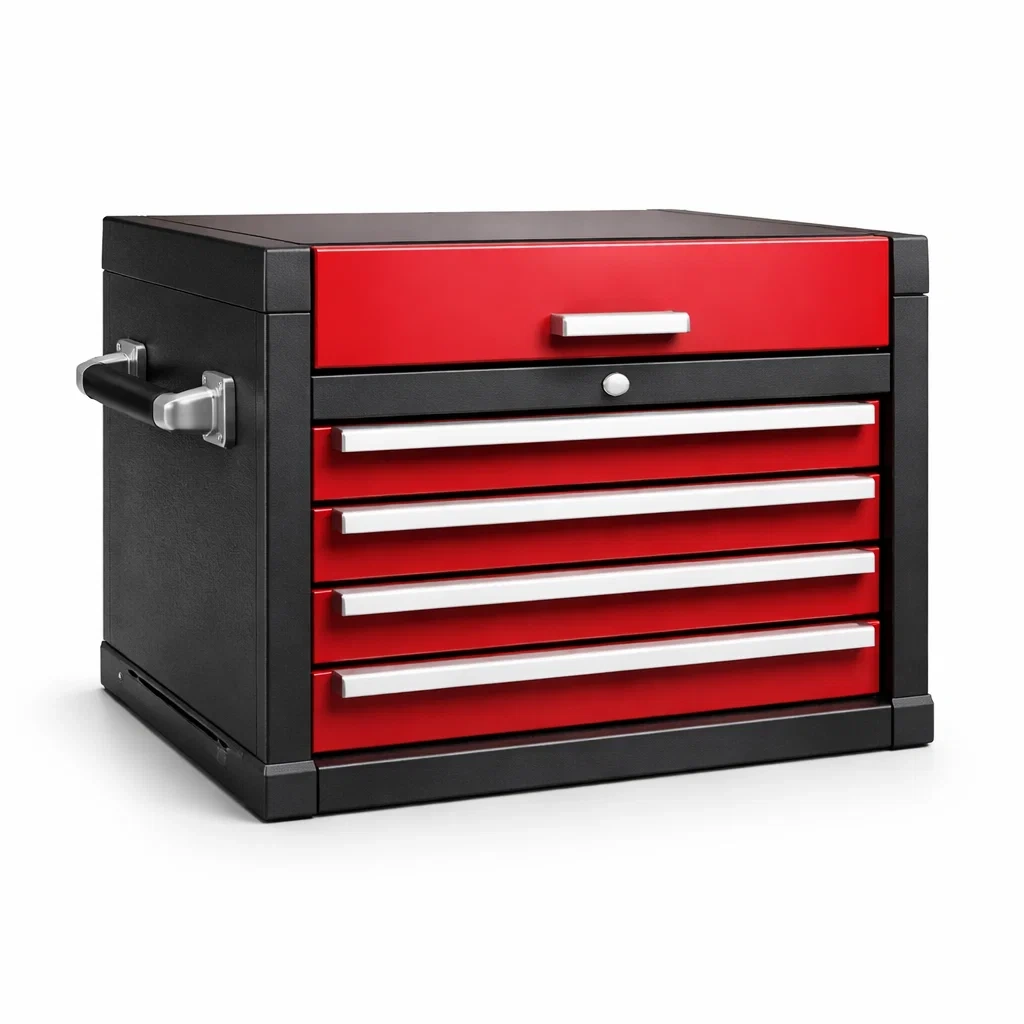 Questa cassettiera in metallo misura 60 cm x 30 cm x 45 cm. Dispone di cinque cassetti per organizzare gli attrezzi. La struttura è in acciaio. La cassettiera è nei colori rosso e nero, con maniglie laterali per il trasporto. Il peso netto del prodotto è di 15 kg.