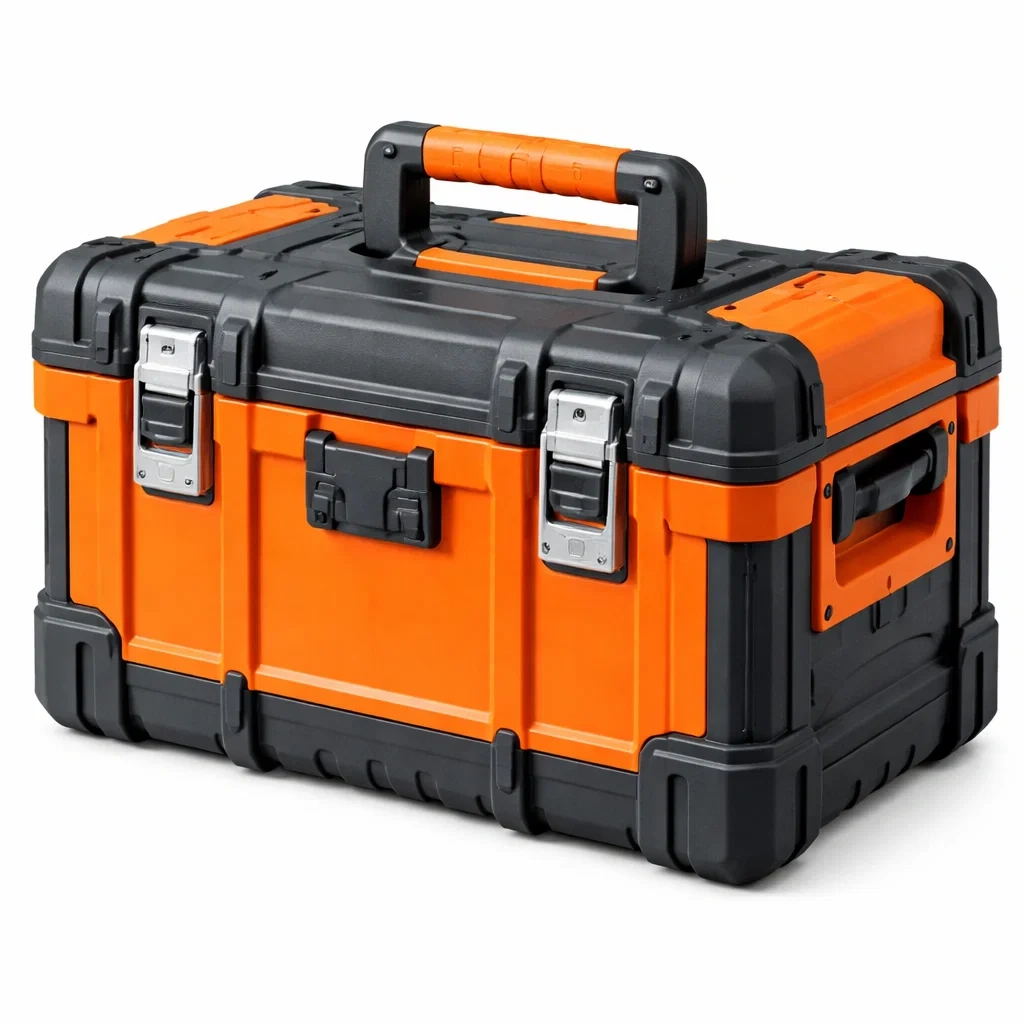 La cassetta degli attrezzi è realizzata in plastica di polipropilene con chiusure in metallo, garantendo resistenza agli impatti. Ha un manico rigido per un facile trasporto e una chiusura a clip in metallo. Le dimensioni sono 50 cm x 25 cm x 30 cm, e il peso è di 3.5 kg.